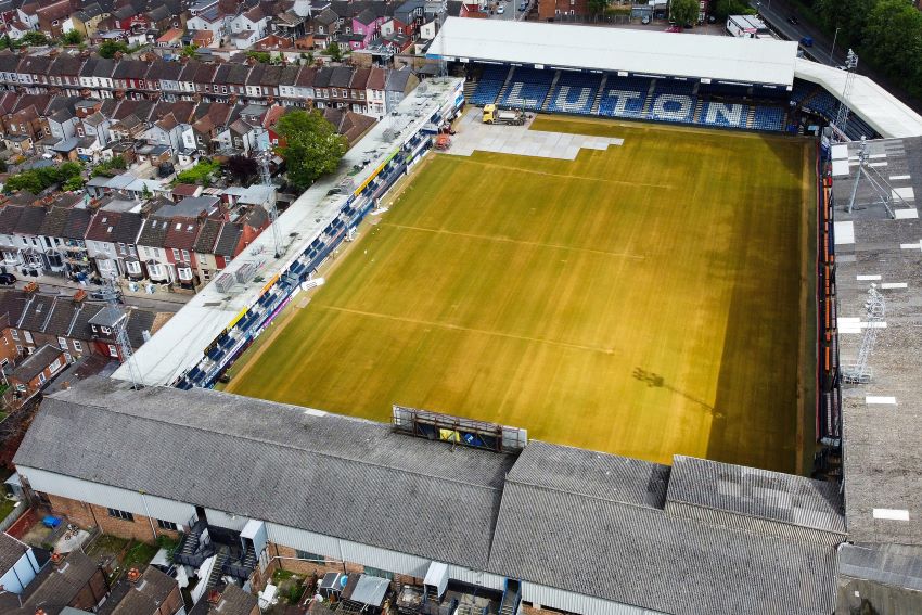 Proses pengerjaan lapangan di Kenilworth Road, kandang Luton Town, pada 31 Mei lalu.