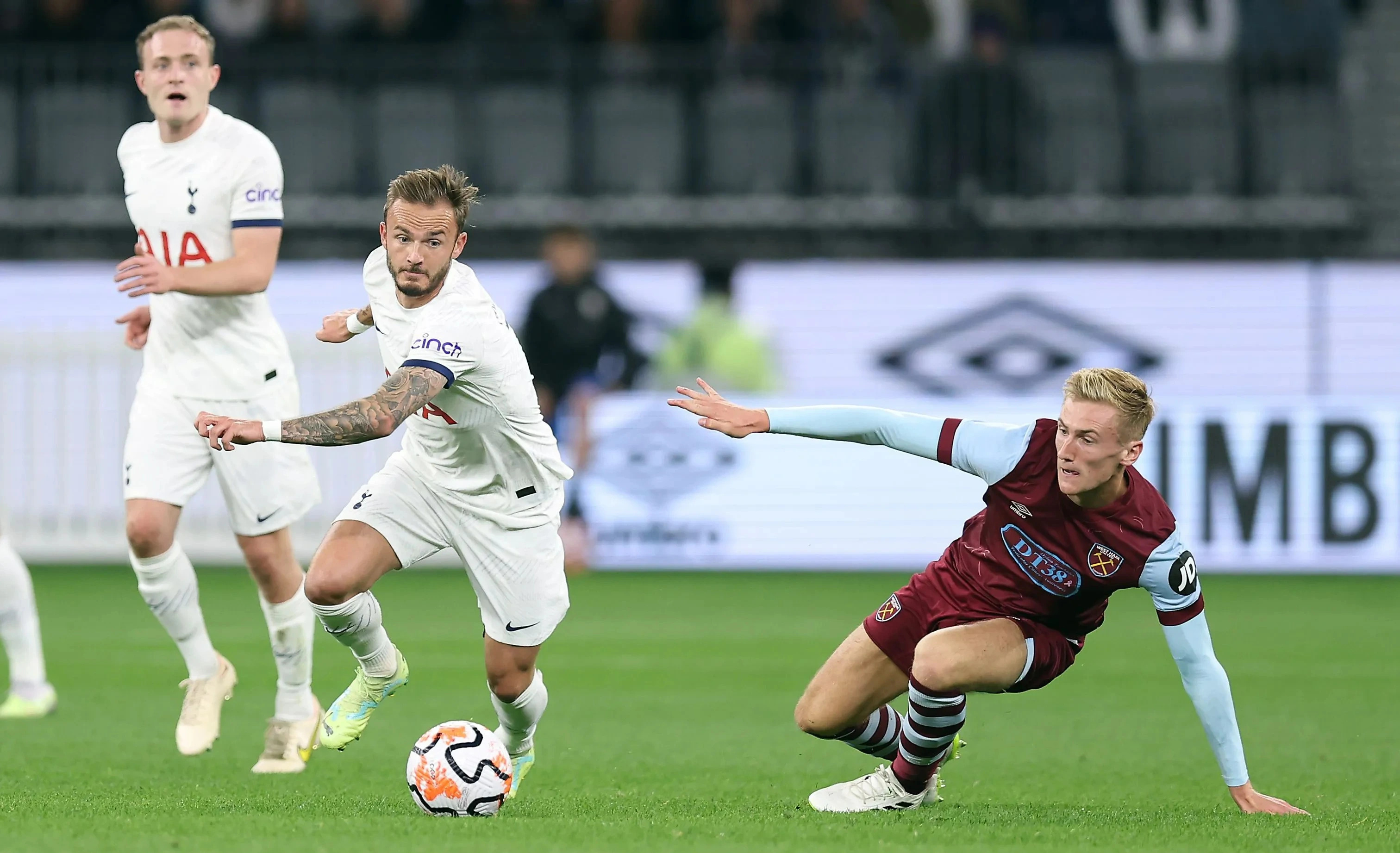 Gelandang serang baru Tottenham Hotspur James Maddison mengenakan nomor 71 saat melawan West Ham di Perth (18/7).
