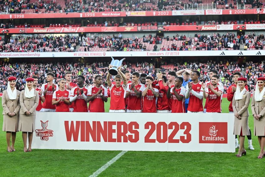 Pemain Arsenal yang diwakili kapten Martin Odegaard mengangkat trofi juara Piala Emirates di Stadion Emirates kemarin (3/8).