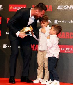 Ketika Lionel Messi menerima penghargaan sepatu emas di Antiga Fabrica Estrella Damm, Barcelona (16/10), karena koleksi golnya musim lalu, dia mengajak istrinya, Antonella Roccuzzo beserta dua putranya, Thiago dan Matteo.