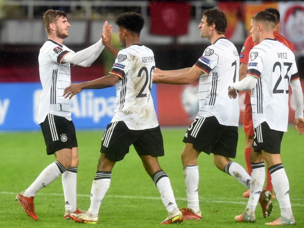 ROBERT ATANASOVSKI/AFP ON FIRE: Striker Jerman Timo Werner (kiri) merayakan gol ke gawang Makedonia Utara dalam laga kualifikasi Piala Dunia 2022 di Tose Proeski National Arena, Skopje, kemarin (12/10).