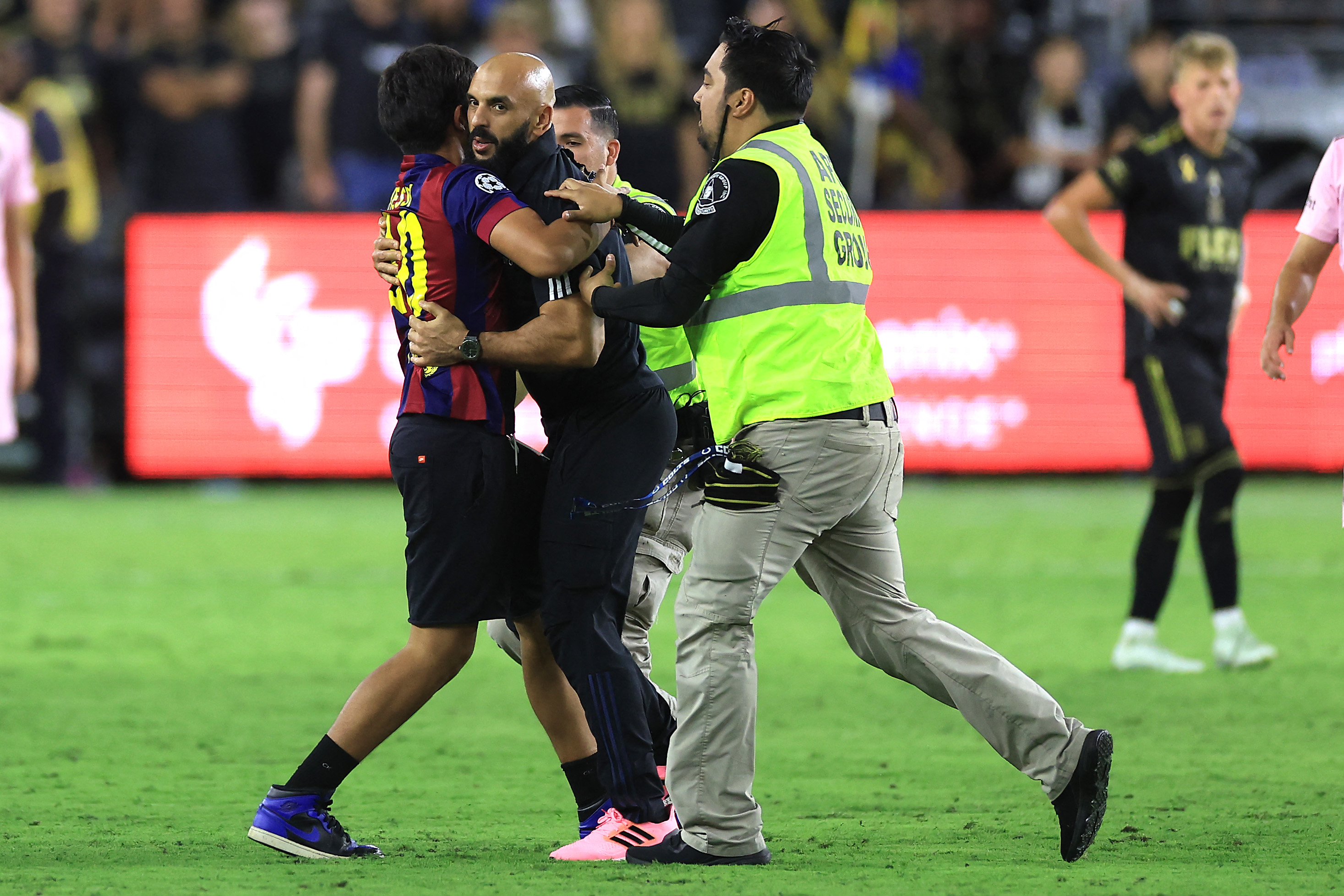 Yassine Chueko mengamankan fans yang ingin mendekati Lionel Messi saat Inter Miami menghadapi Los Angeles FC di BMO Stadium kemarin (4/9).