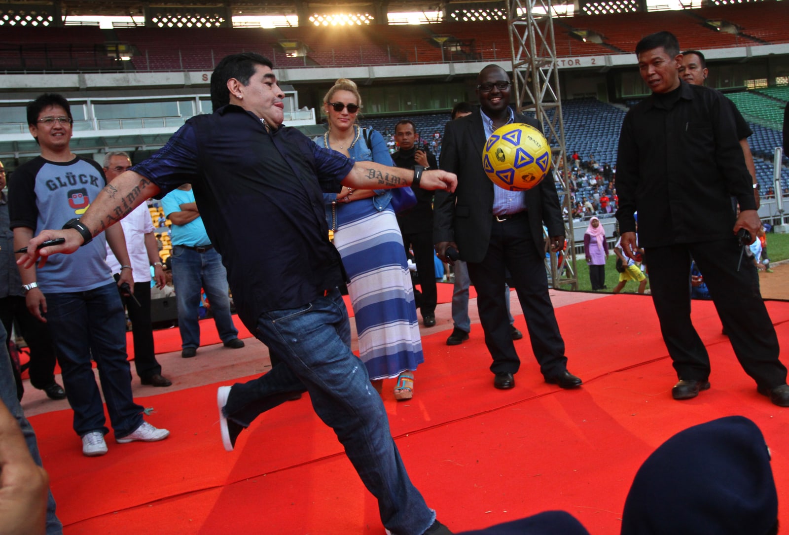 Diego Armando Maradona saat hadir di Stadion Gelora Bung Karno, Senayan, Jakarta (29/6). (Angger Bondan/Jawa Pos)