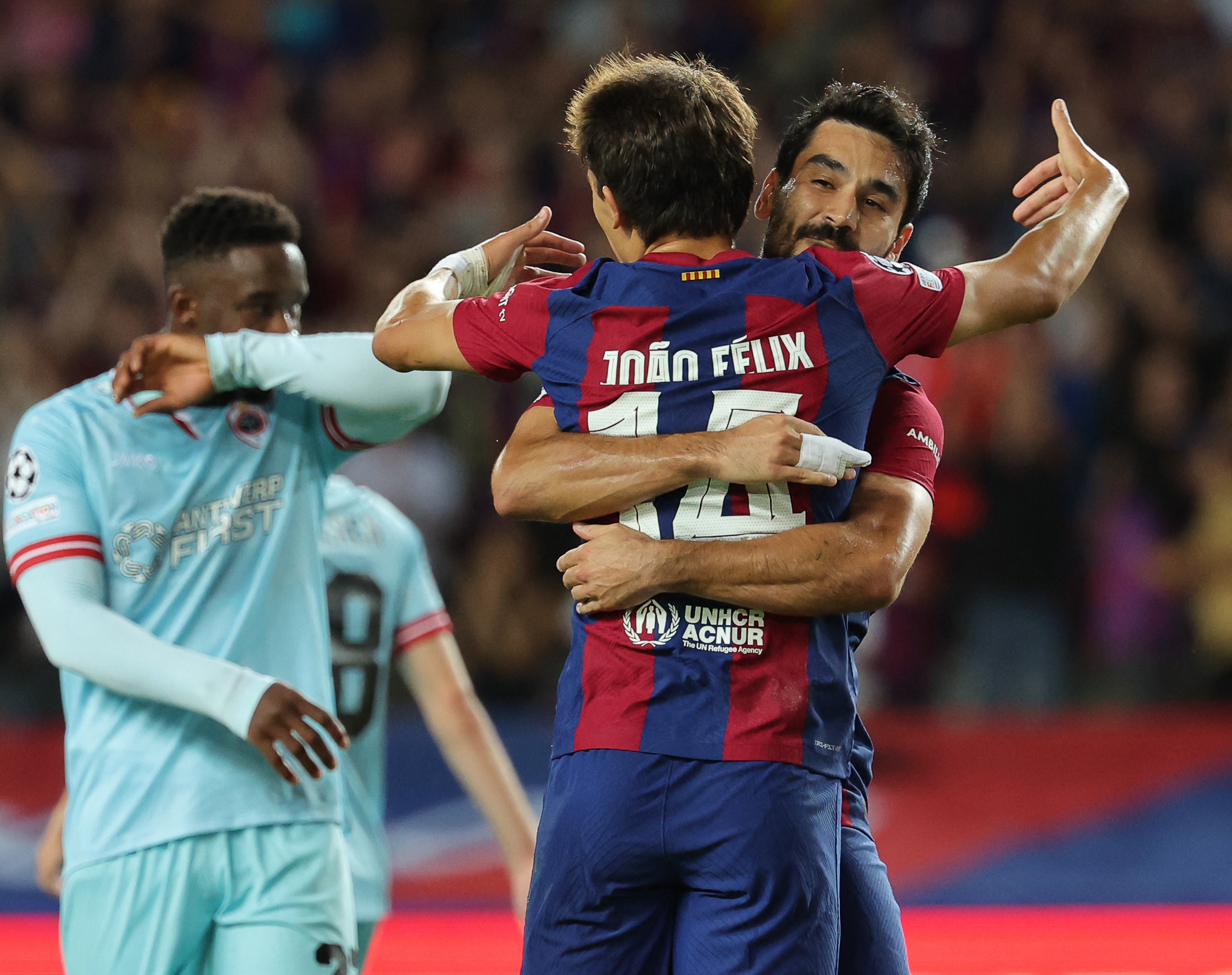 Ilkay Gundogan memeluk Joao Felix setelah koneksi mereka menghasilkan gol pertama FC Barcelona atas Royal Antwerp dalam matchday pertama grup H Liga Champions di Estadi