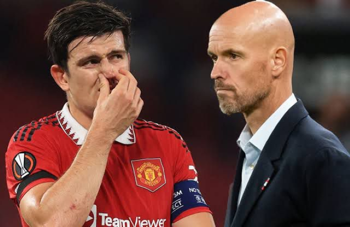 Harry Maguire (kiri) akan dijual Manchester United setelah ban kaptennya dilucuti Erik Ten Hag.
