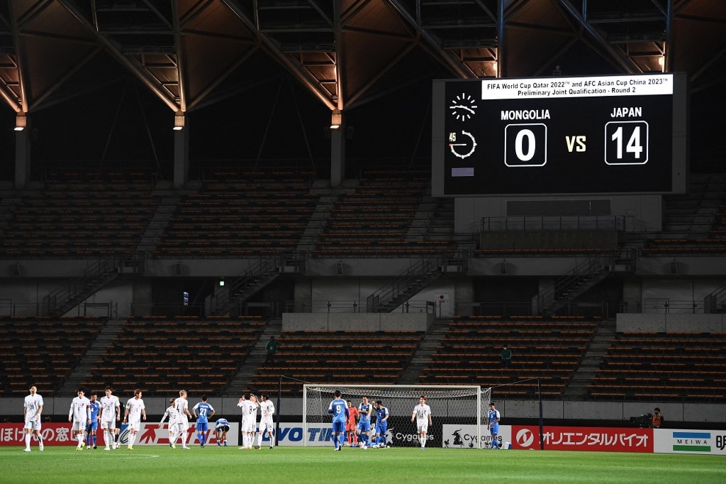 A general view shows the FIFA World Cup Qatar 2022 Asian zone group F qualification football match between Japan (white) and Mongolia at Fuku-ari stadium in Chiba on March 30, 2021. (Photo by CHARLY TRIBALLEAU / AFP)