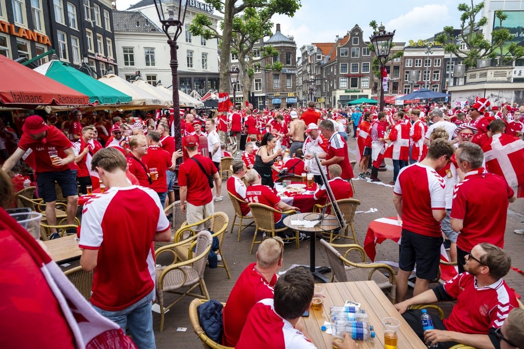 Fans of Denmark flood Rembrandtplein square in Amsterdam, on June 26, 2021, ahead of the UEFA EURO 2020 round of 16 football match between Wales and Denmark. (Photo by Evert Elzinga / ANP / AFP) / Netherlands OUT