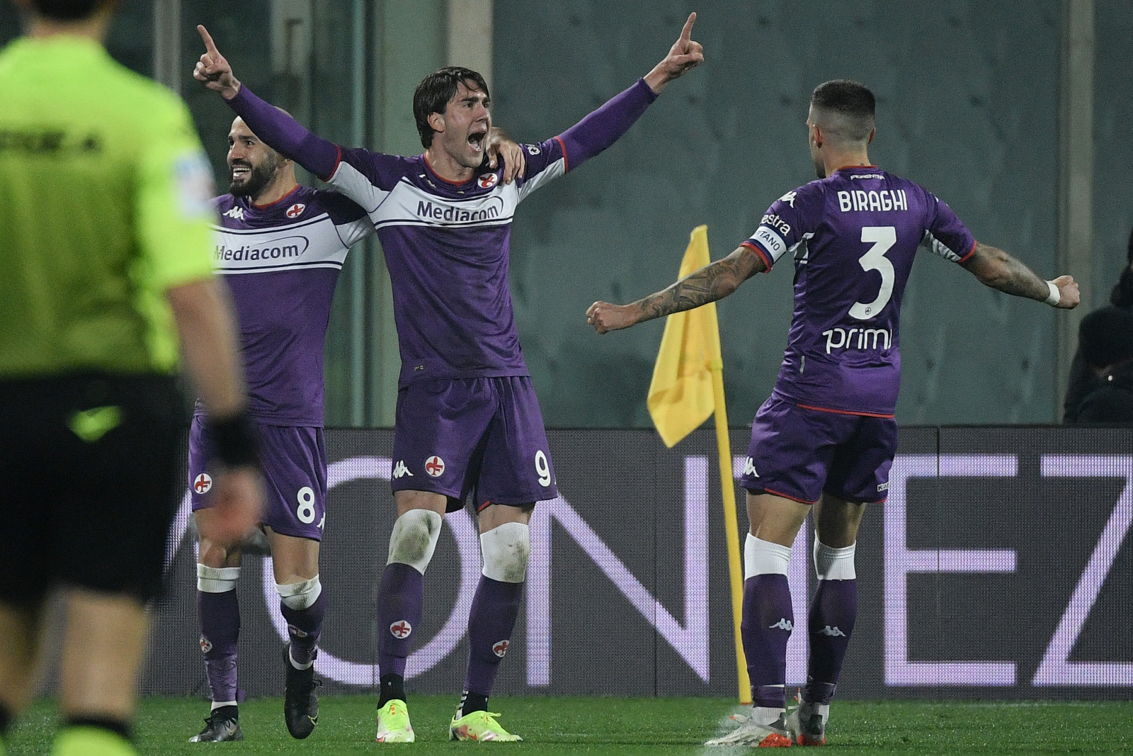 FILIPPO MONTEFORTE/AFP MUDA DAN MAHAL: Striker ACF Fiorentina Dusan Vlahovic (tengah) merayakan gol ke gawang AC Milan di Artemio Franchi (21/11/2021).