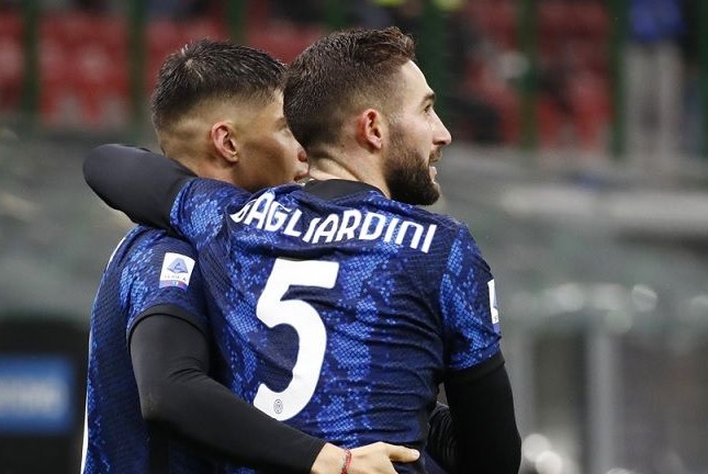 Gelandang Inter Milan Roberto Gagliardini (kanan) melakukan selebrasi bersama Joaquin Correa seusai mencetak gol ke gawang Spezia dalam laga lanjutan Liga Italia di Stadion Giueseppe Meazza, Milan, Italia, Rabu (1/12) waktu setempat. Alessandro Garofalo/R