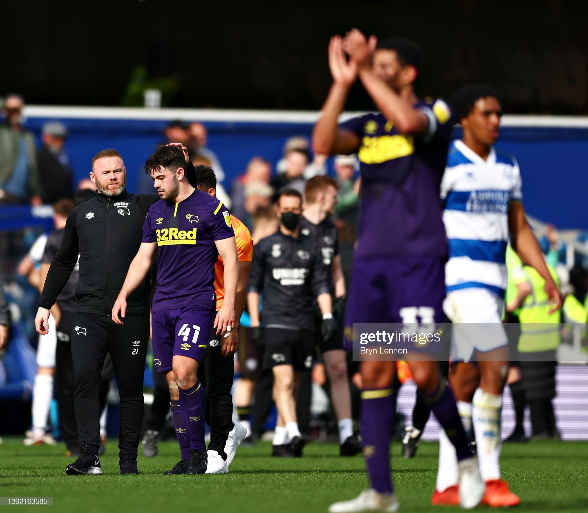 LONDON, ENGLAND - APRIL 18: Wayne Rooney, Manager of Derby County, reacts with Eiran Cashin after the final whistle of the Sky Bet Championship match between Queens Park Rangers and Derby County at The Kiyan Prince Foundation Stadium on April 18, 2022 in