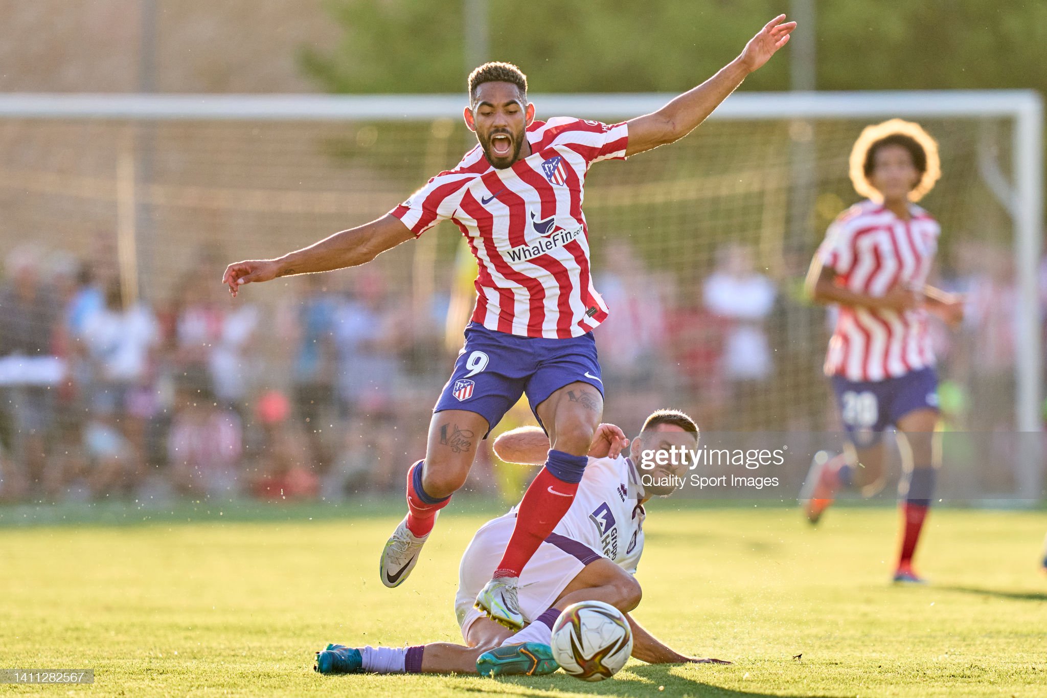 BURGOS, SPAIN - JULY 27: Bonaldo of Numancia battles for the ball with Matheus Cunha of Atletico de Madrid during the pre-season friendly match between Numancia and Atletico de Madrid at Estadio Burgo de Osma on July 27, 2022 in Soria, Spain. (Photo by Di