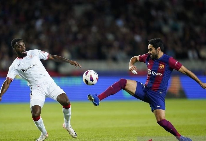 Pesepak bola Barcelona Ilkay Gundogan berebut bola dengan pesepak bola Athletic Club Inaki Williams dalam lanjutan Liga Spanyol di Stadion Lluis Companys, Barcelona, Spanyol (22/10/2023).