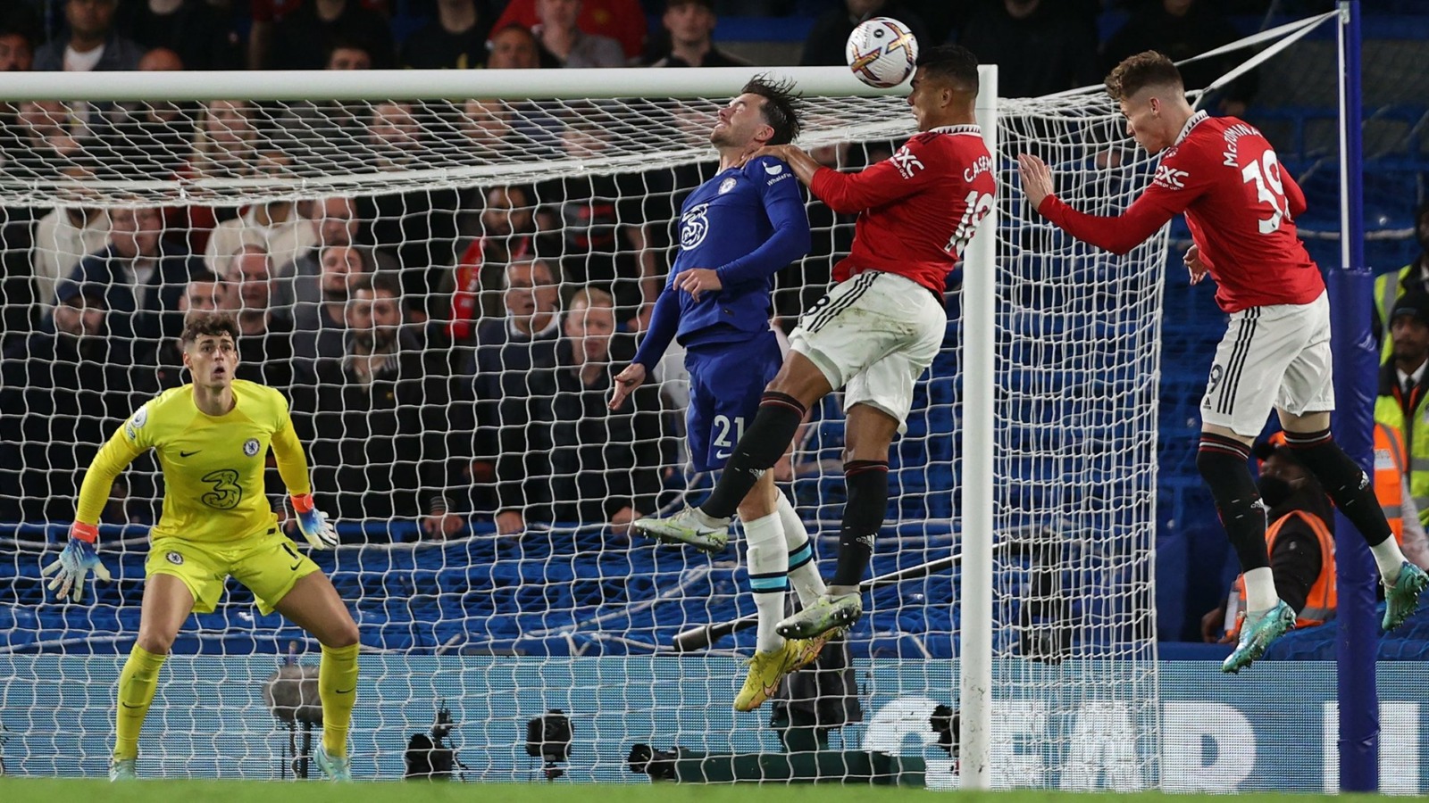 ASH DONELON/MANCHESTER UNITED PENYELAMAT: Casemiro (dua dari kanan) mencetak gol sundulan untuk menghindarkan Manchester United dari kekalahan saat menghadapi Chelsea di Stamford Bridge.