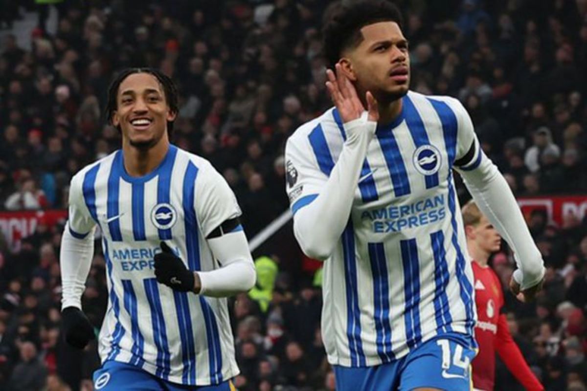 Pemain Brighton berselebrasi setelah mencetak gol ke gawang Manchester United saat matchday ke-21 Liga Premier Inggris di Old Trafford, Minggu (19/1) WIB. (@OfficialBHAFC/X/Antara)