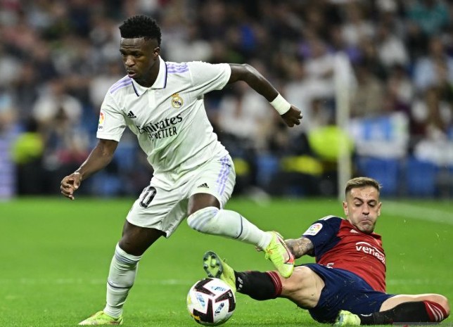 Bek Osasuna Ruben Pena (kanan) mencoba menghentikan laju penyerang Real Madrid Vinicius Jr dalam pertandingan Liga Spanyol pada Senin (3/10). Javier Soriano/AFP/Antara