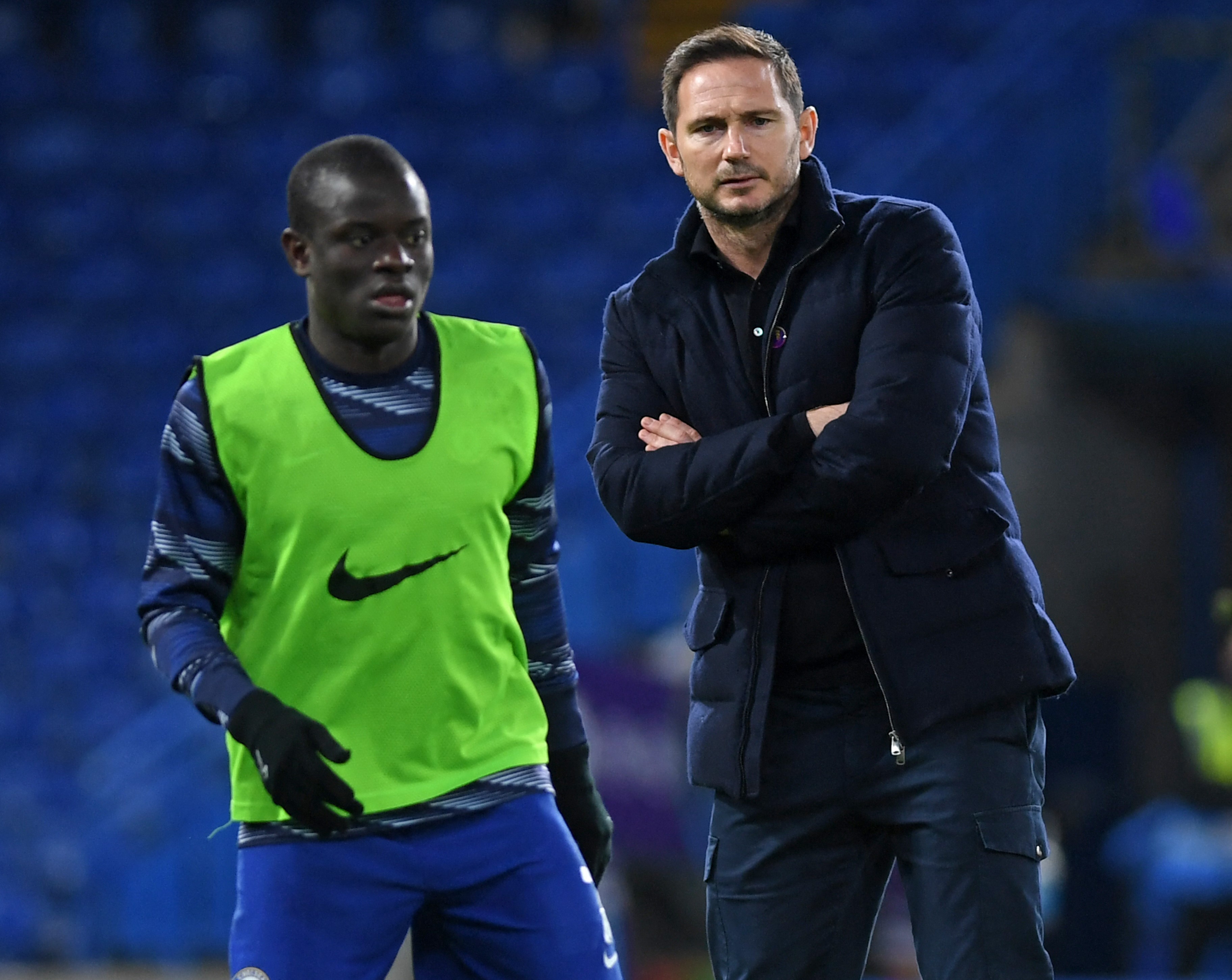 Frank Lampard dengan gelandang Chelsea N’Golo Kante di Stamford Bridge. Lampard mengaku timnya tak cukup kuat untuk mengalahkan Real Madrid.