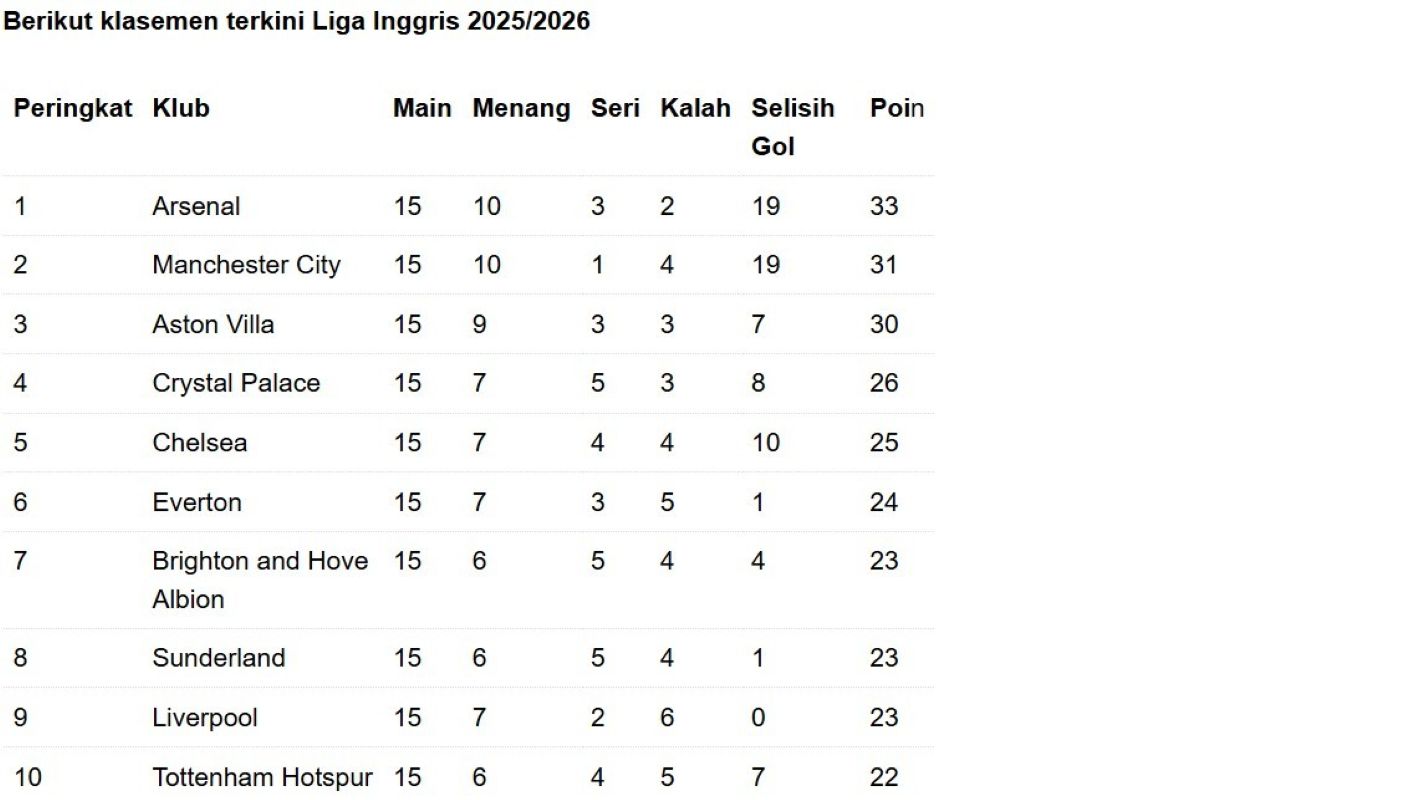 Klasemen sementara 10 besar liga Inggris. (antara)