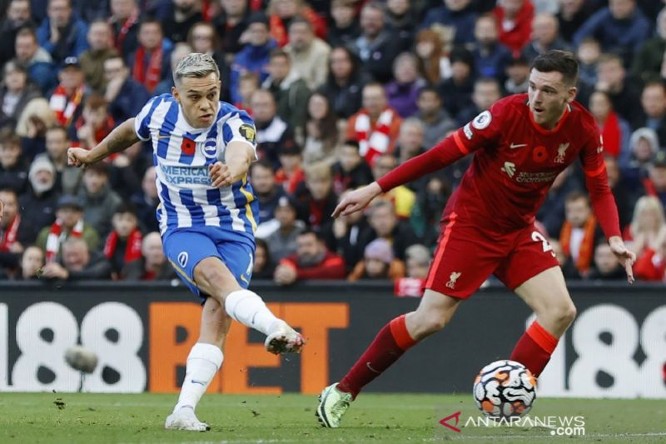 Penyerang Brighton & Hove Albion Leandro Trossard (kiri) melepaskan tembakan untuk mencetak gol kedua timnya ke gawang Liverpool dalam laga lanjutan Liga Inggris di Stadion Anfield, Liverpool, Inggris, Sabtu (30/10). Phil Noble/Reuters/Antara
