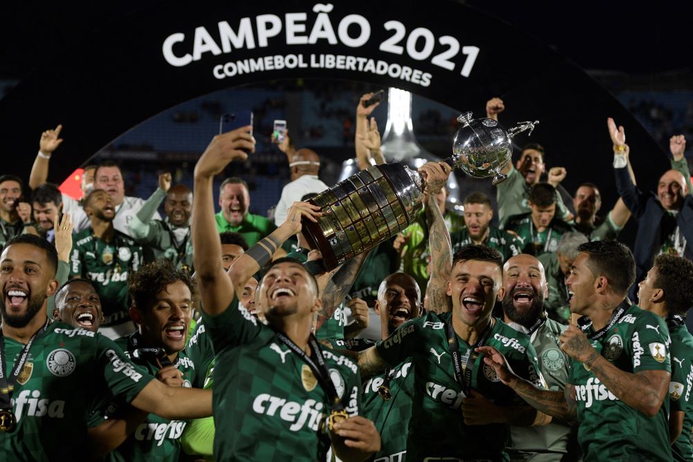 JUAN MABROMATA/AFP BACK-TO-BACK: Para pemain Palmeiras berselebrasi sebagai kampiun Copa Libertadores 2021 di Estadio Centenario, Montevideo, kemarin.