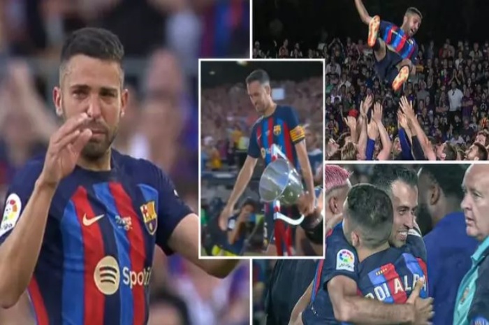 Jordi Alba (kiri) sampai menangis saat dia bersama Sergio Busquets menjalani laga terakhir bersama Barcelona di Camp Nou.