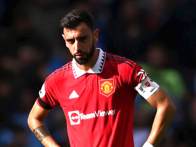 TURUT BERDUKA: Gestur kapten Manchester United Bruno Fernandes dalam kekalahan telak 3-6 dari Manchester City di Etihad Stadium, Minggu malam (2/10). (FA IMAGES)