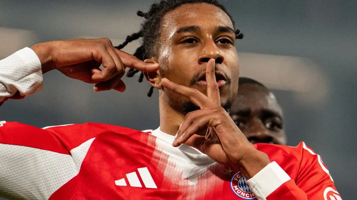 Pemain Bayern Munchen Michael Olise merayakan gol saat menghancurkan Atalanta 6-1 pada leg pertama babak 16 besar Liga Champions. (Dok. Munchen)