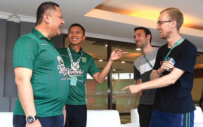 ANTUSIAS: Presiden Persebaya Azrul Ananda ditemani Wakil Wali Kota Surabaya Whisnu Sakti Buana (kiri) mengobrol dengan dua jurnalis asal Jerman, Martin Becker (kanan) dan Marco Peters.