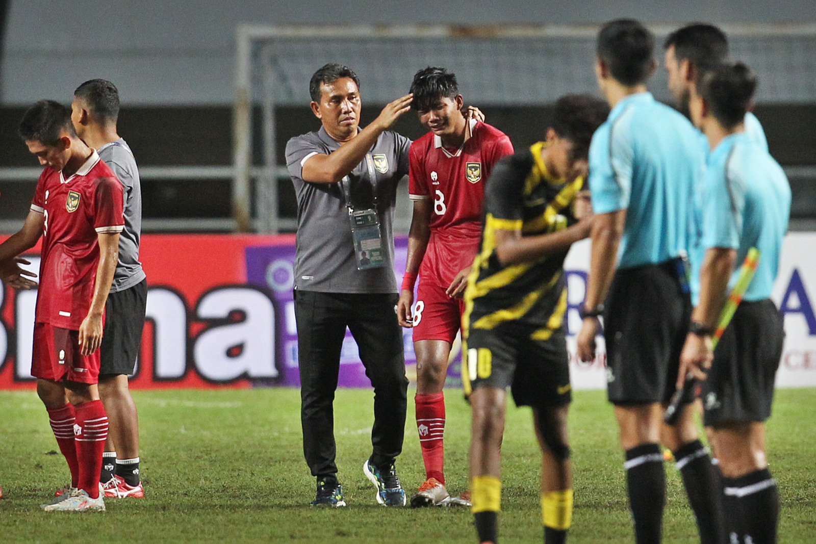 Pelatih Indonesia U17 Bima Sakti (kiri) memeluk pesepak bola Indonesia U17 Arkhan Kaka usai kalah melawan Malaysia U17 dalam laga lanjutan kualifikasi piala AFC U17 distadion Pakansari, Bogor, Jawa Barat, Minggu (9/10/2022). HARITSAH ALMUDATSIR/JAWA POS
