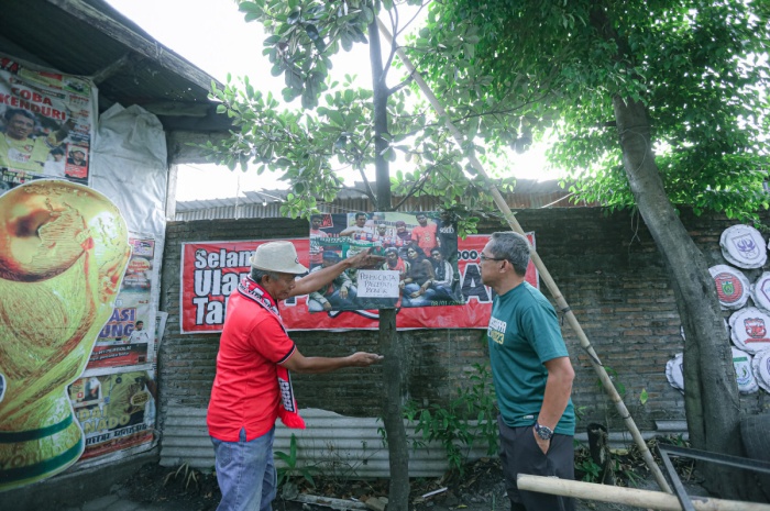 Pelatih Persebaya Surabaya Aji Santoso (kanan) saat mengunjungi Museum Titik Nol Pasoepati, di mana Aji ditunjukkan pohon perdamaian antara Pasoepati dengan Bonek. (persebaya)
