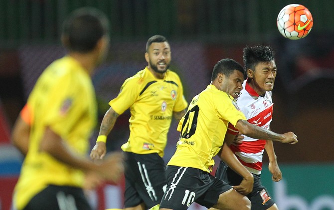 DUEL: Pemain Madura United Rizky Dwi Febrianto berebut bola dengan pemain Semen Padang Vendry Mofu dalam laga di Gelora Ratu Pamelingan, Pamekasan Madura (8/2).
