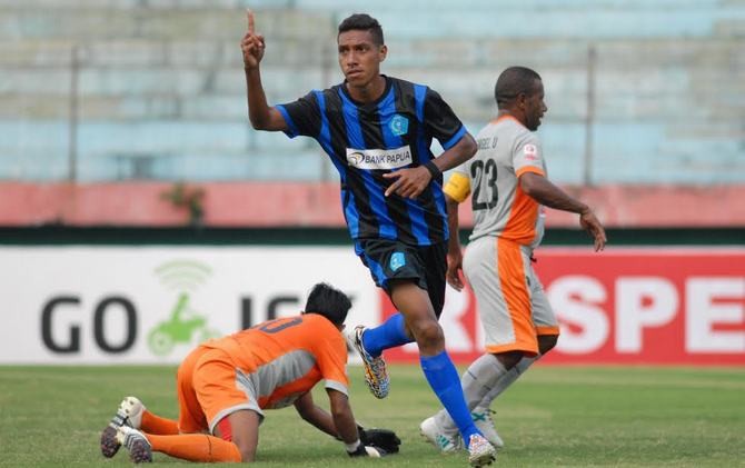 Selebrasi Pencetak gol pertama PSBS Biak, Delfin Rumbino.