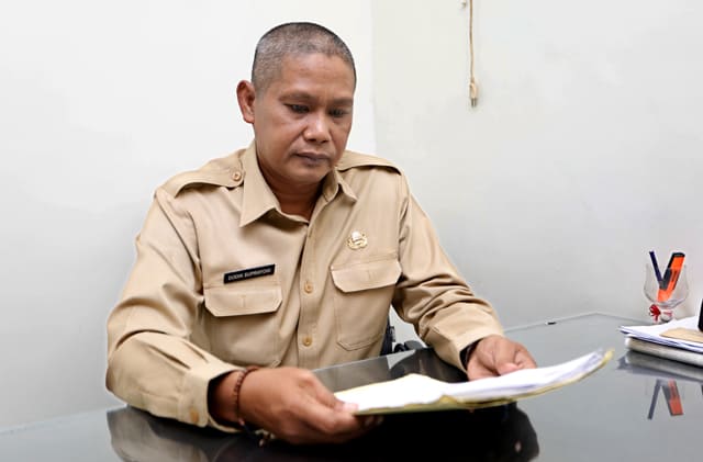 Dodik Suprayogi, kepala desa Kepatihan, Gresik yang merupakan mantan pemain Persebaya saat bertugas di kantor Balai Desa Kepatihan, Gresik, kemarin (6/7). FOTO: Angger Bondan/Jawa Pos