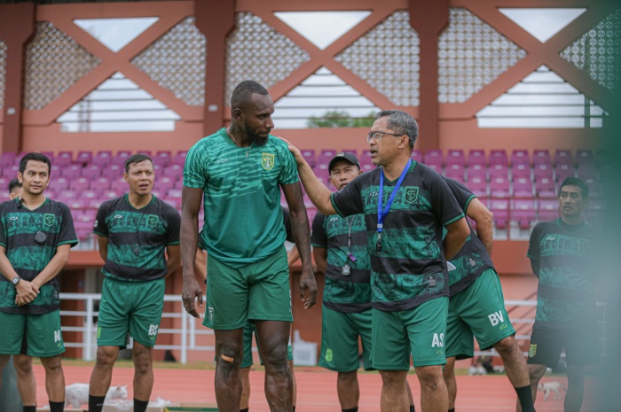Aji Santoso memberikan instruksi kepada Yohanes Kandaimu saat menjalani latihan di Surabaya. Anis merasa perlu adaptasi dengan permainan cepat Green Force. (persebaya.id)