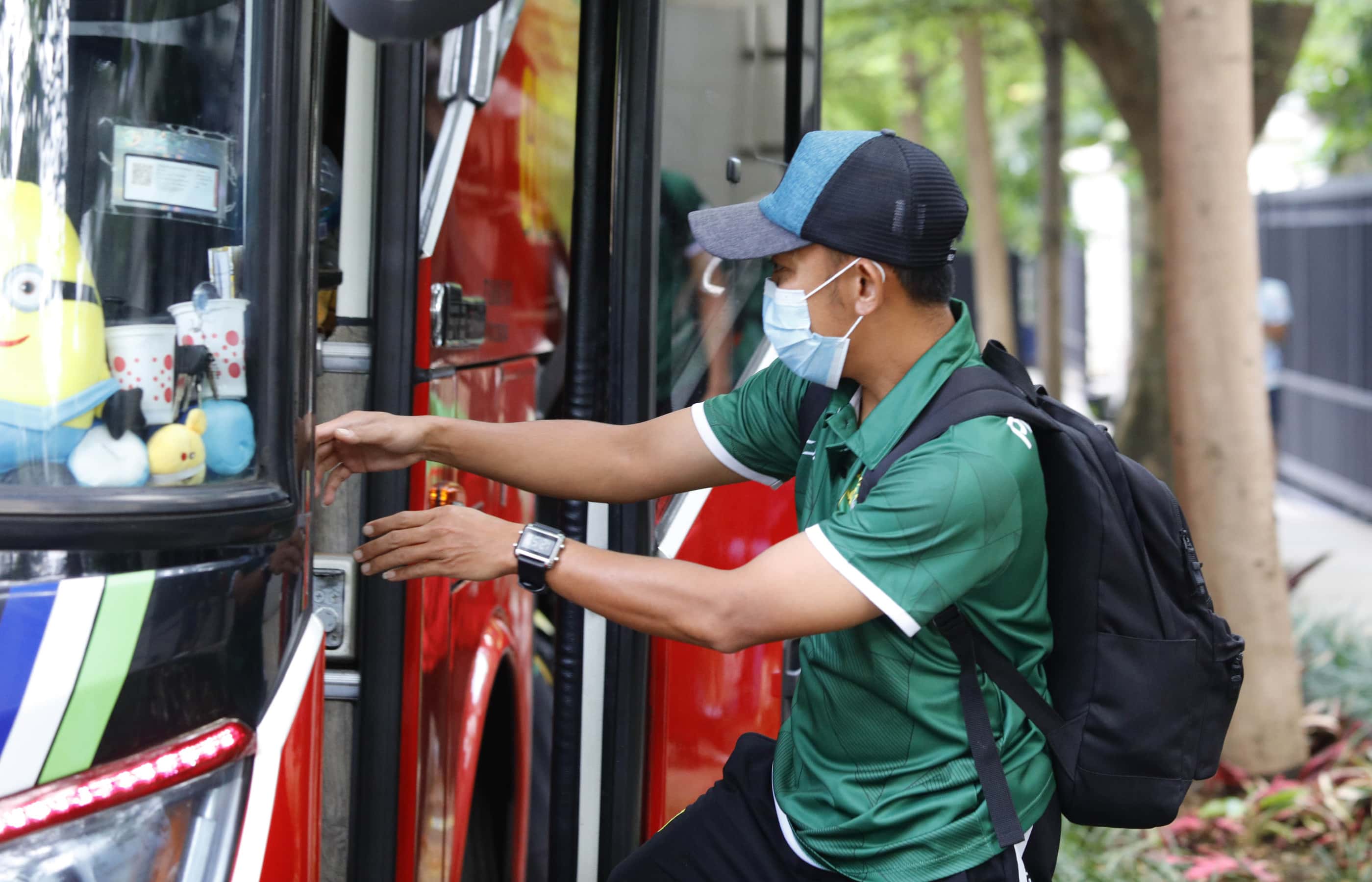 Rendi Irwan, gelandang Persebaya naik ke dalam bus di depan Hotel Ibis Style Diponegoro, Bandung, kemarin (8/4). FOTO: Angger Bondan/Jawa Pos