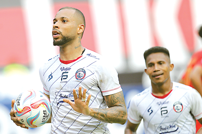 TOP SCORER SEMENTARA: Gustavo Almeida memborong dua gol Arema FC ke gawang Persija Jakarta di Stadion Patriot Candrabhaga, Bekasi (20/8). Sementara ini, dia menjadi top scorer Liga 1 2023– 2024.