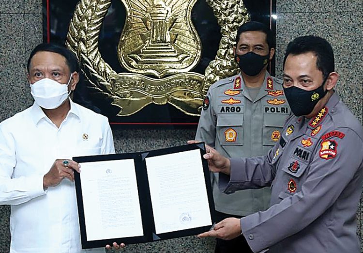 RESMI: Kapolri Jenderal Listyo Sigit Prabowo (kanan) dan Menpora Zainudin Amali menunjukkan surat resmi izin keramaian Liga 1 dan Liga 1 2021 di Mabes Polri, Jakarta, keramaian (31/5). (DIVHUMAS MABES POLRI FOR JAWA POS)