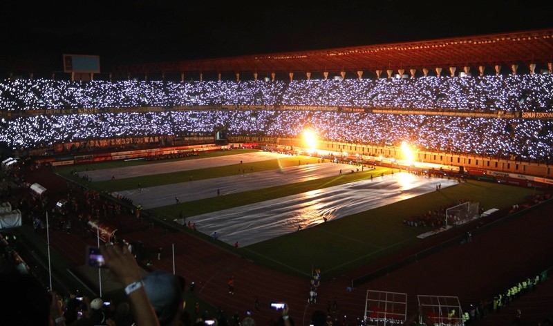 Penonton menyaksikan pertunjukan pembukaan Liga 1 2020 di Stadion Gelora Bung Tomo, Surabaya, kemarin (29/2). FOTO: Angger Bondan/Jawa Pos