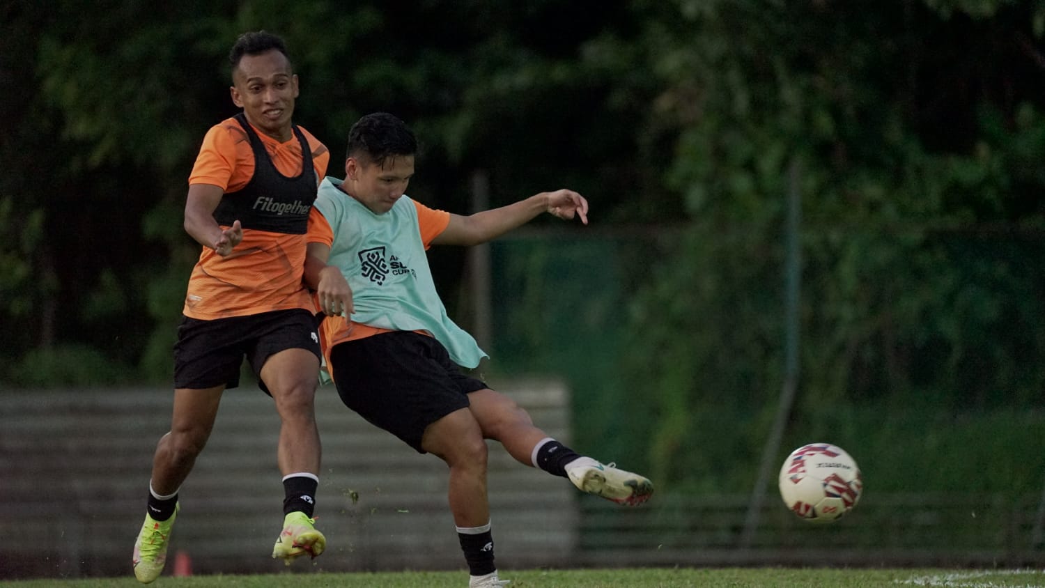 TIM MEDIA PSSI FOR JAWA POS SIAP TEMPUR: Irfan Jaya (kiri) dan Syahrian Abimanyu menjalani latihan terakhir bersama timnas di Stadion Gombak, Singapura, tadi malam.