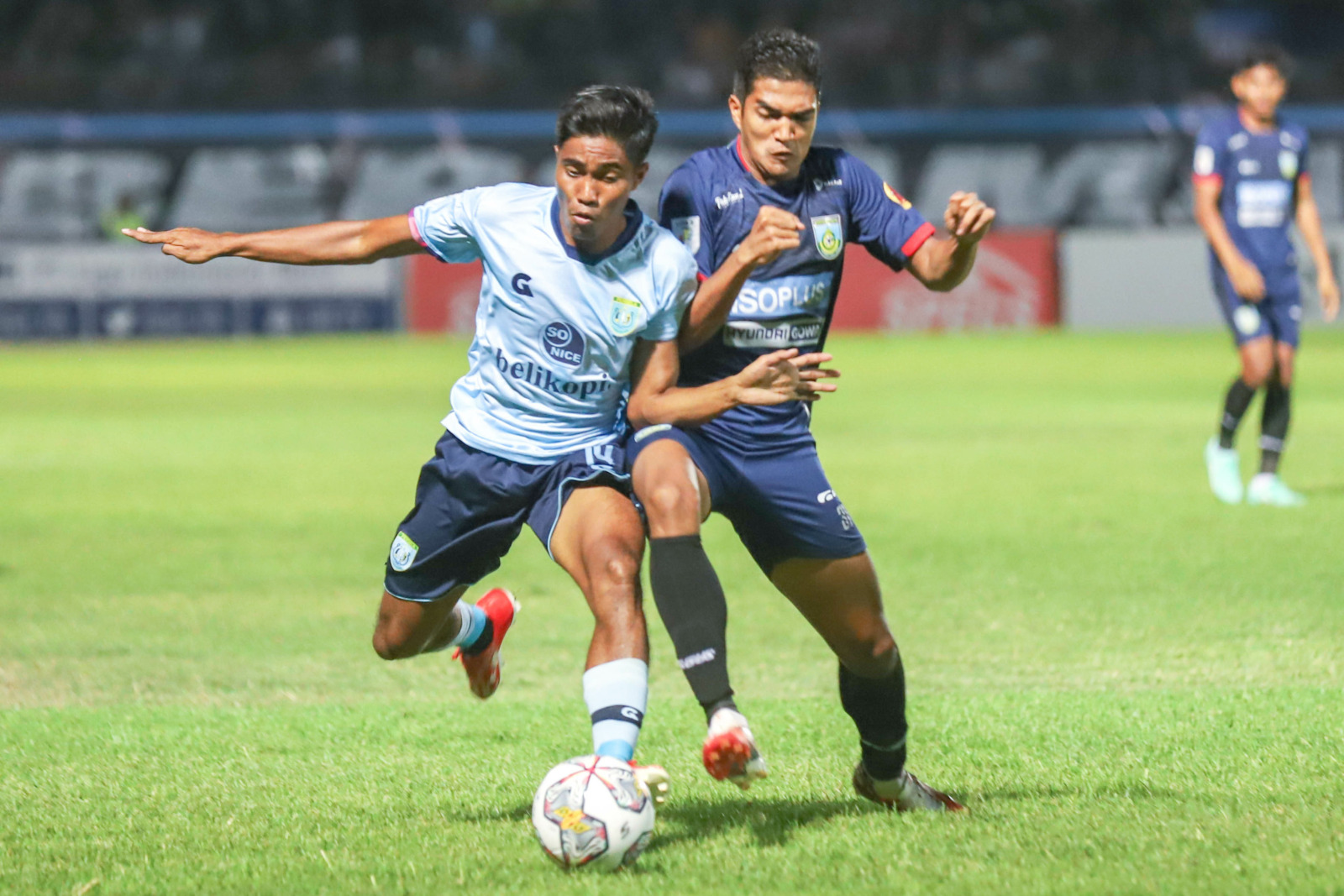 BERBAGI POIN: Pemain Persela Lamongan Elpin Pulu Kandahi Wali (kiri) berebut bola dengan Iftiqar Rizal ALLEX QOMARULLA/JAWA POS