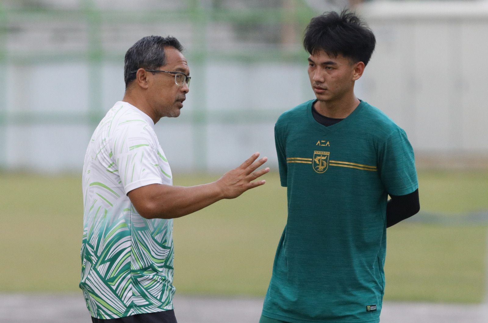 Muhammad Iqbal (kanan) yang menjalani trial di tim Persebaya berbincang dengan paltih kepala, Aji Santoso usai sesi latihan di Stadion Gelora Sepuluh November, Surabaya, kemarin (28/12). FOTO: ANGGER BONDAN/JAWA POS