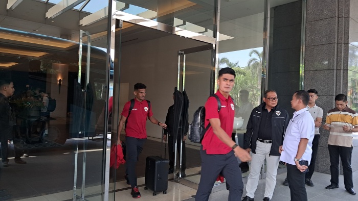Ramadhan Sananta (depan) dan Ricky Kambuaya meninggalkan Hotel Fairmont untuk berangkat ke Bandara Internasional Soekarno Hatta. (Dimas Ramadhan/JawaPos.com)