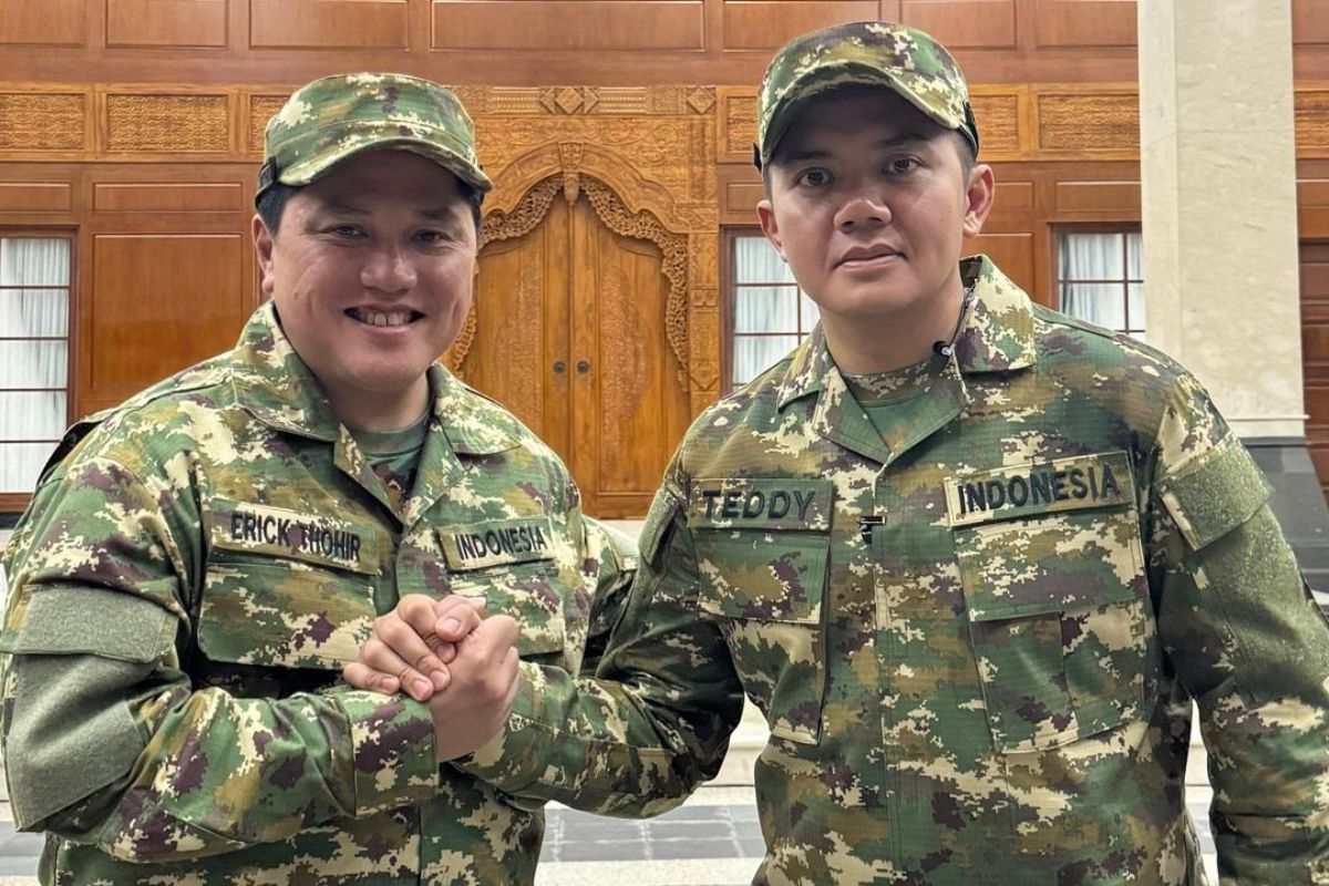 Ketum PSSI sekaligus Menteri BUMN, Erick Thohir (kiri), bersalaman dengan Mayor Teddy saat pembekalan di Akmil Magelang. (Instagram @erickthohir)