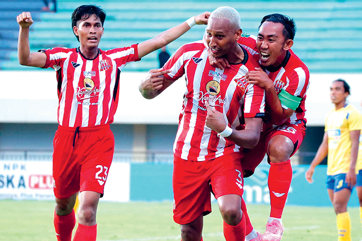 BEK TAJAM: Artur Vieira (tengah) merayakan gol ke gawang Gresik United di Stadion Tuban Sport Center kemarin. Itu adalah golnya yang ketiga musim ini. (TIM MEDUA DELTRAS FC)