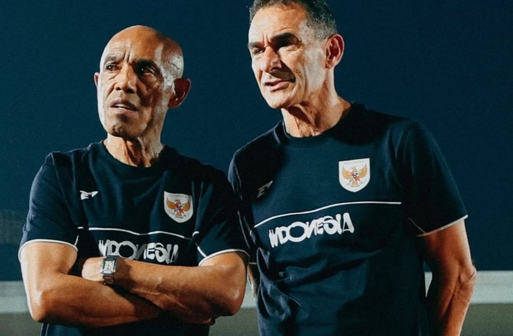Pelatih Timnas U23 Gerald Vanenburg (kanan) bersama Direktur Teknik Simon Tahamata memantau latihan (Timnas Indonesia)