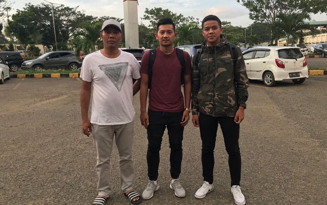 Dari kiri, Ketua Harian Aceh United, Moh Saadan Abidin, Rully Desrian, dan Feri Sistianto tiba di Bandara Sultan Iskandar Muda (SIM), Aceh Besar, Minggu (7/1)