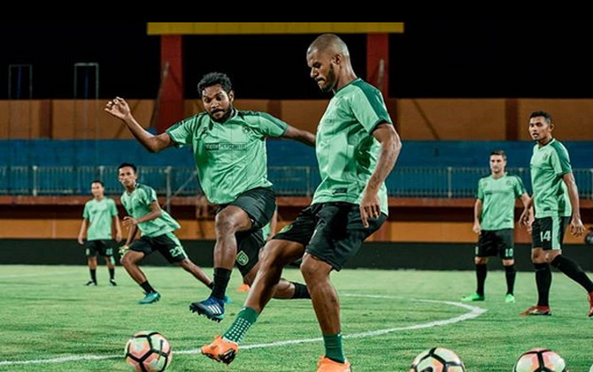 Striker Persebaya Surabaya, David Da Silva (depan) saat menjalani latihan bersama rekan-rekannya.