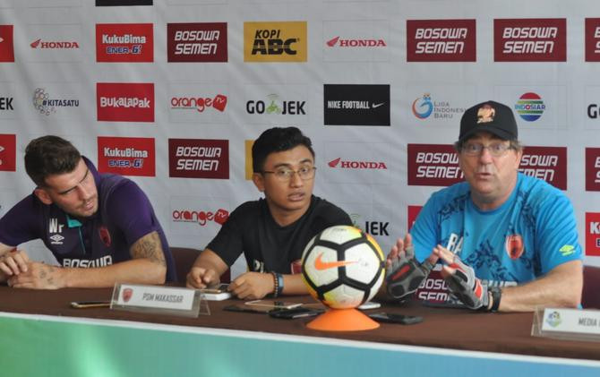 Robert Rene Alberts didampingi Wiljan Pluim dalam jumpa pers di Stadion Andi Mattalatta, Jumat (8/6)