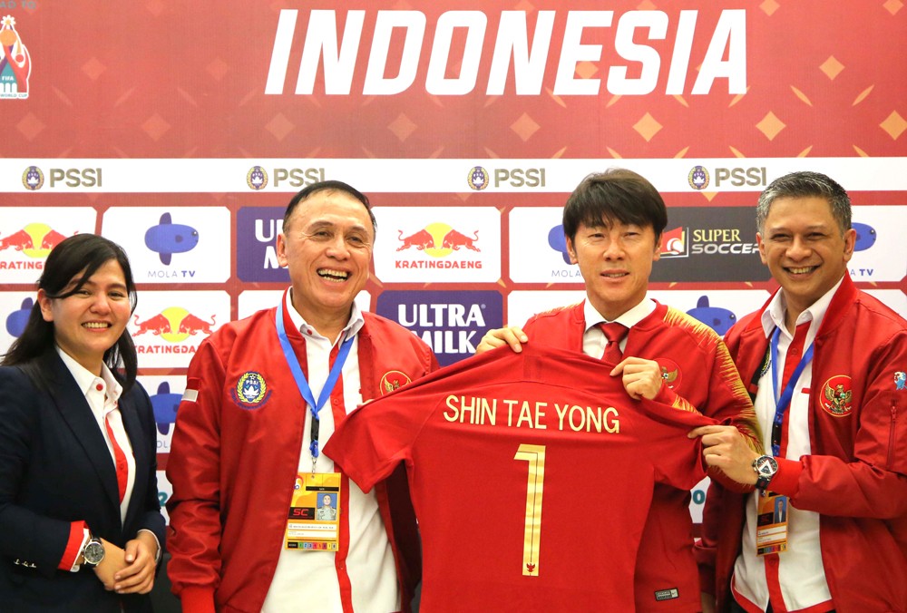 TANTANGAN MENANTI: Shin Tae-yong (dua dari kanan) diperkenalkan di Stadion Pakansari, Kabupaten Bogor, kemarin. Turut hadir tiga petinggi PSSI, yaitu Ketua Umum M. Iriawan (dua dari kiri), Sekjen Ratu Tisha, dan Wakil Ketua Umum Iwan Budianto. (Chandra Sa