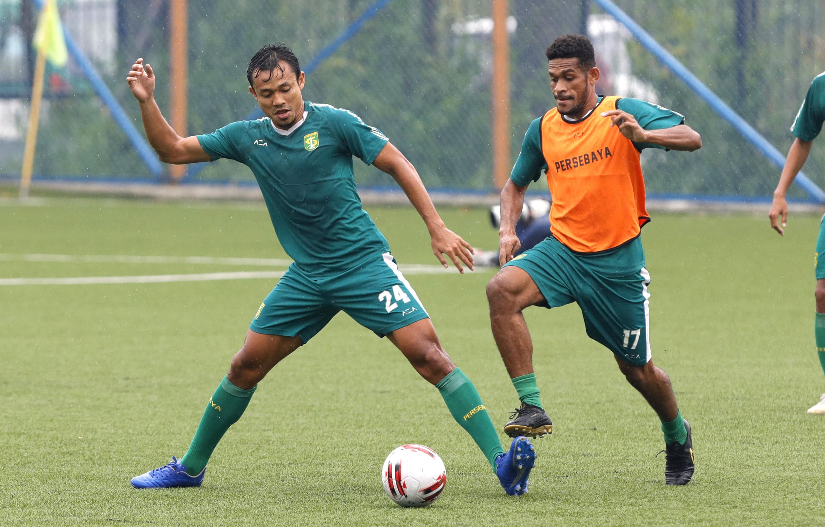 Arif Satria (kiri) berebut bola dengan Ricky Kambuaya saat sesi latihan Persebaya di Lapangan Sintetis Si Jalak Harupat, Bandung, kemarin (30/3). FOTO: Angger Bondan/Jawa Pos