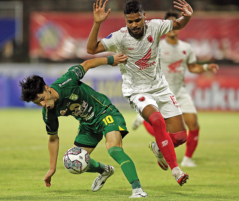 SELESAI TENGAH MALAM: Pemain Persebaya Taisei Marukawa (kiri) berbebut bola dengan Hasyim Kipuw dari PSM di Denpasar tadi malam. (HARITSAH ALMUDATSIR/JAWA POS)